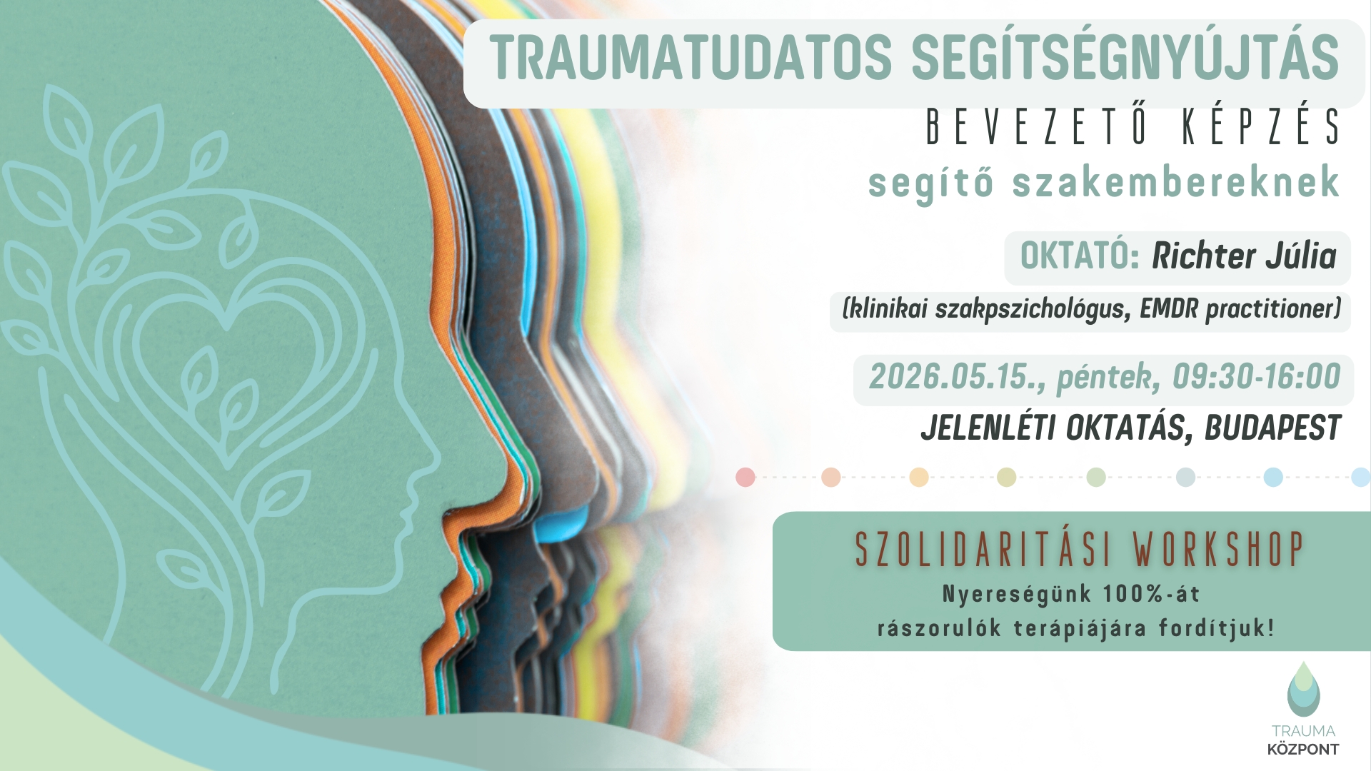 2026. február 25.Traumatudatos segítségnyújtás – egynapos bevezető képzés, 2026.05-15-én: kiscsoportos, interaktív workshop elméleti és gyakorlati elemekkel.